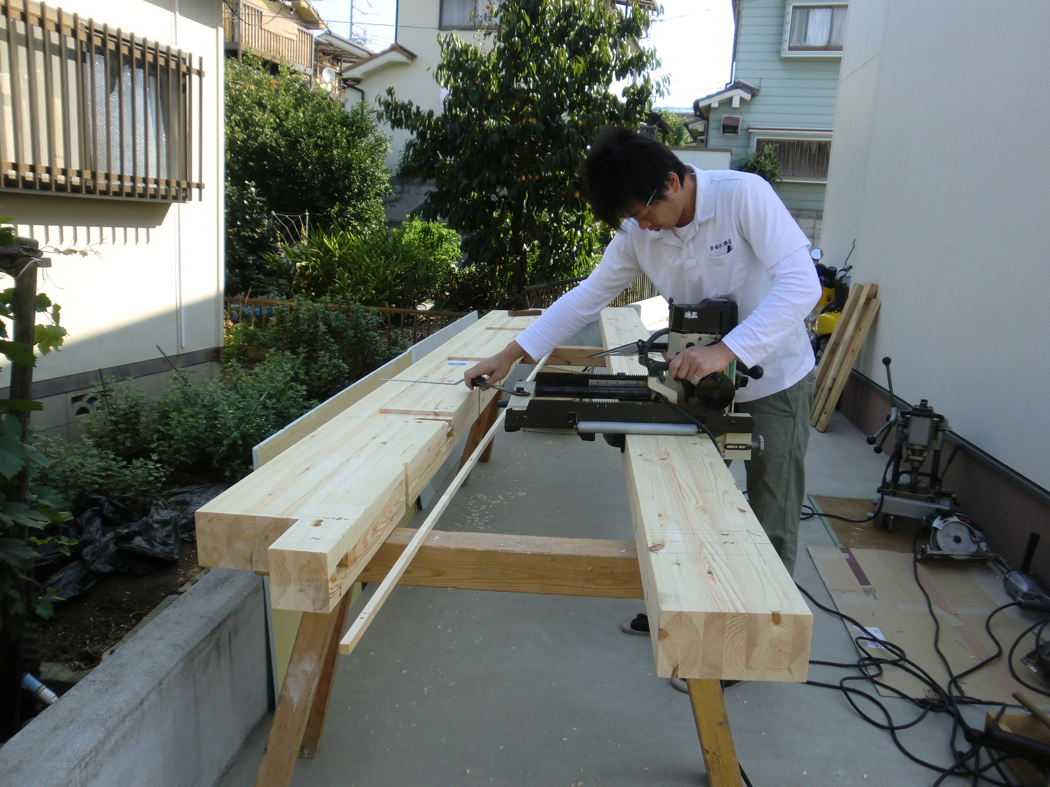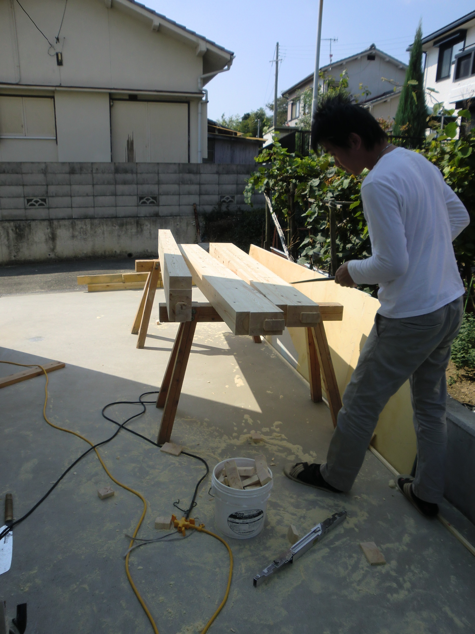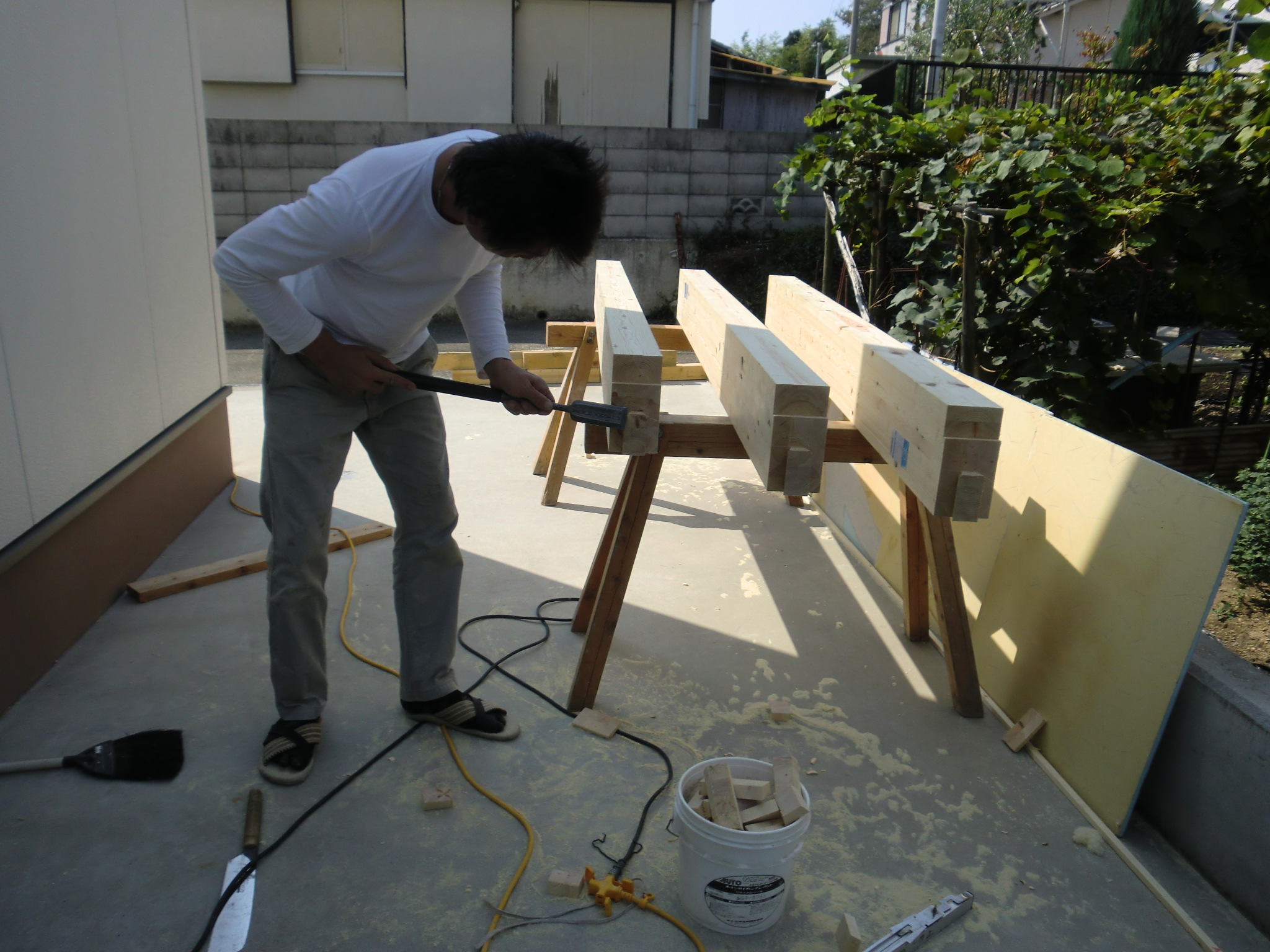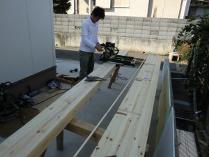 倉庫で増築の材木の下準備